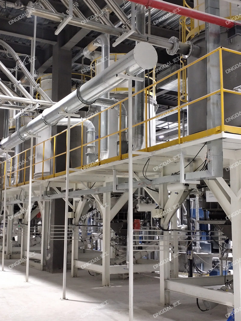 在物料預(yù)處理環(huán)節(jié),創(chuàng)新采用噸包破包工作站,對(duì)1種重鈣與3種輕鈣原料進(jìn)行集中拆包處理,配置專用除塵裝置實(shí)現(xiàn)無(wú)塵化作業(yè)。四類物料經(jīng)封閉式管道分別輸送至獨(dú)立的大型儲(chǔ)料倉(cāng),通過(guò)倉(cāng)體結(jié)構(gòu)優(yōu)化與流化裝置設(shè)計(jì),有效避免粉體板結(jié)、架橋等問(wèn)題,確保原料存儲(chǔ)穩(wěn)定性。