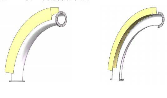 宏工設計的背包式彎頭是由普通彎頭和扣接于彎頭外壁處的填充背包組成。物料在長期使用中將填充物磨掉,將有物料進入填充腔內,物料將會與物料進行摩擦,減少物料對彎頭處的磨損。使彎頭的使用周期大大增加,減少更換和修補耐磨彎頭的次數(shù)。